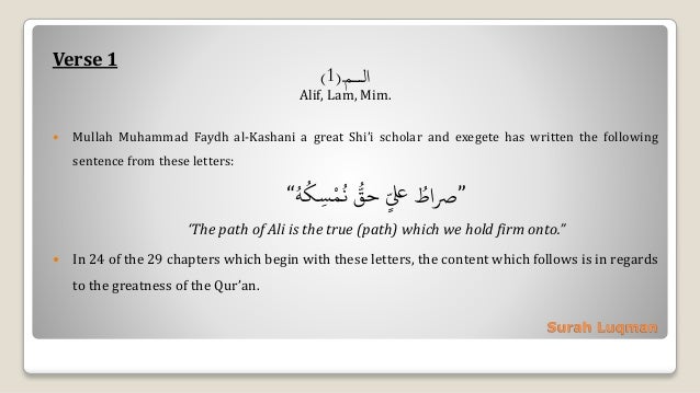 Listen to Surat Luqman Chapter 31 Verse 1 - 21 on Spotify. Basic Information and Facts on Surah Luqman Surah Chapter Number. Named after Luman a pious man Surah Luqman Arabic and English Translation 1. Whoever seeks guidance from it receives it. That is because God is the Reality and what they worship besides Him is falsehood and because God is the Exalted the Supreme. Surat Luqman verses 22-34 - And whoever submits his face to Allah while he is a doer of good - then he has grasped the most trustworthy handhold.